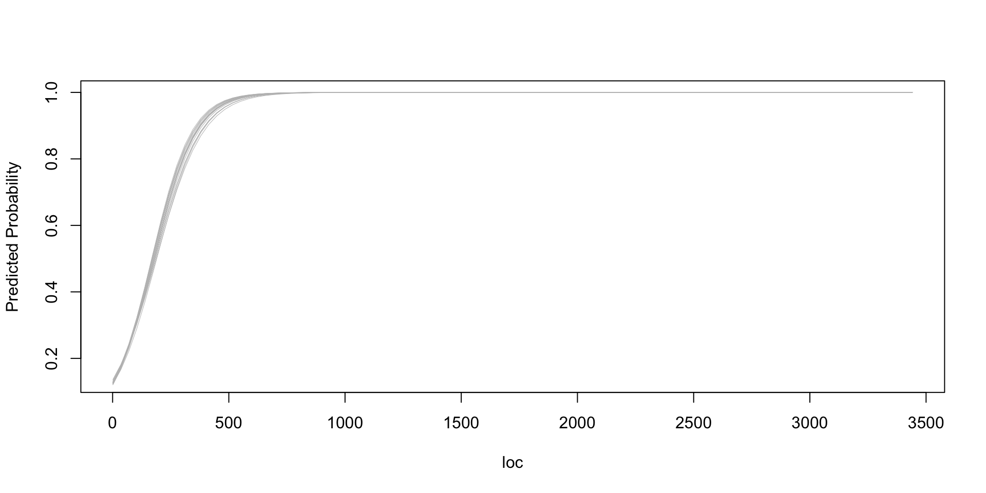 plot(x, invlogit(sims_1[1,1] + sims_1[1,2]*x), type="n", xlab="loc", ylab="Predicted Probability")