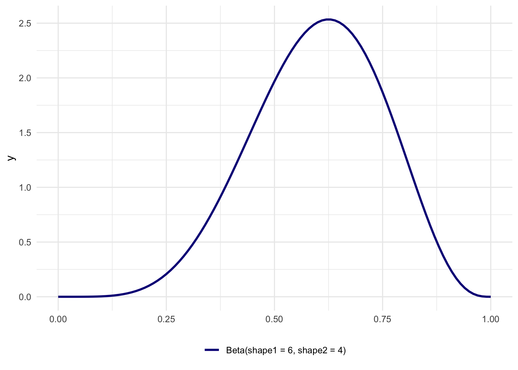 In a Beta distribution, the \(a\) and the \(b\) in that equation correspond to the shape1 and shape2 parameters. If we want to look at the distribution of scores for this test where most people get 6/10, or 60%, we can use 6 and 4 as parameters. Most people score around 60%, and the distribution isn’t centered—it’s asymmetric. Neat!