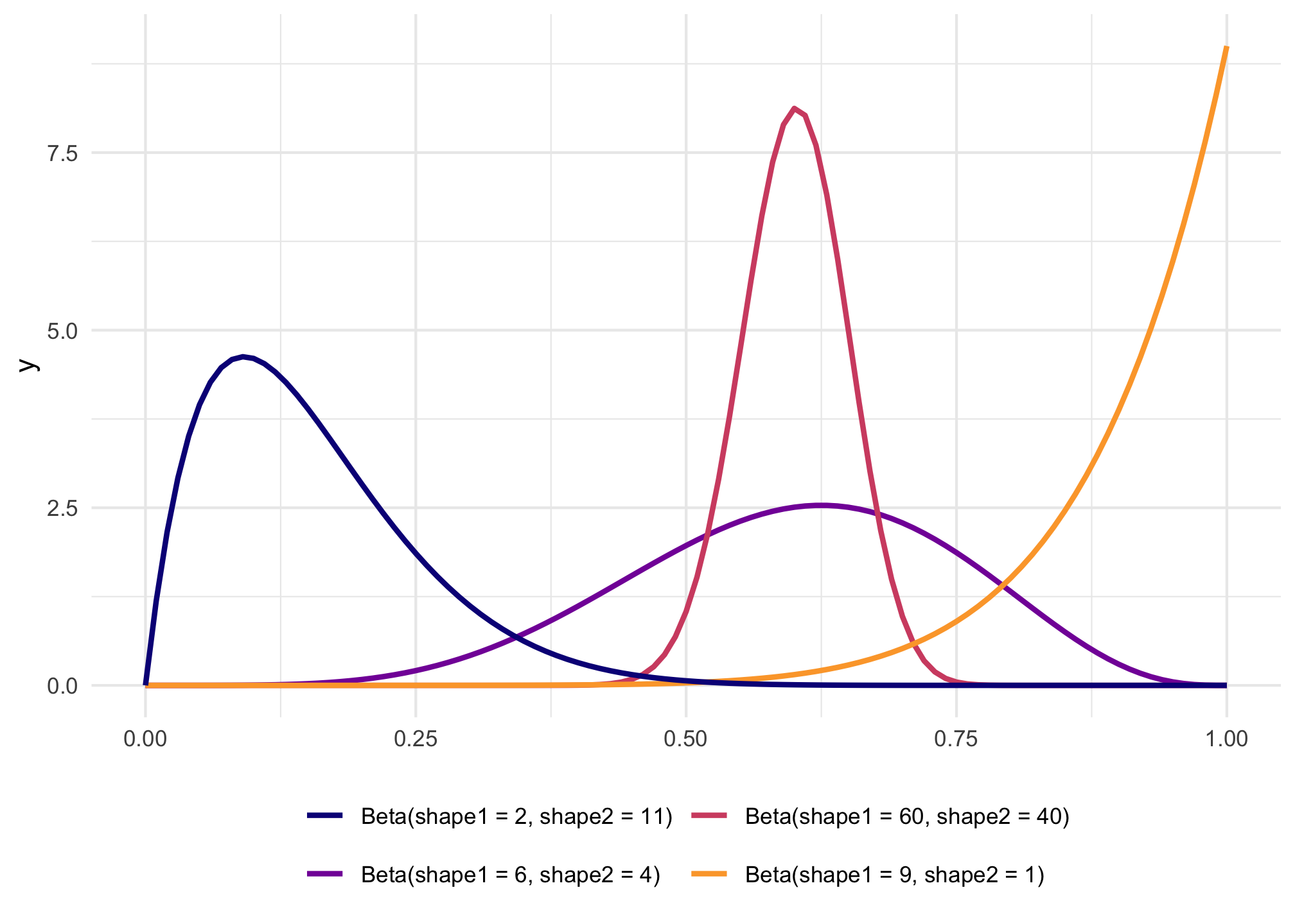 To figure out the center of each of these distributions, think of the \(\frac{a}{a+b}\) formula. For the blue distribution on the far left, for instance, it’s \(\frac{2}{2+11}\) or 0.154. The orange distribution on the far right is centered at \(\frac{9}{9+1}\), or 0.9. The tall pink-ish distribution is centered at 0.6 (\(\frac{60}{60+40}\)), just like the \(\frac{6}{6+4}\) distribution, but it’s much narrower and less spread out. When working with these two shape parameters, you control the variance or spread of the distribution by scaling the values up or down.