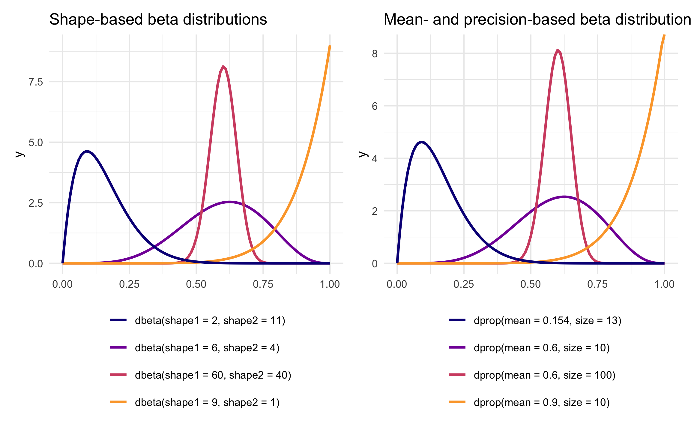 R has built-in support for the shape-based beta distribution with things like dbeta(), rbeta(), etc. We can work with this reparameterized \(\mu\)- and \(\phi\)-based beta distribution using the dprop() (and rprop(), etc.) from the {extraDistr} package. It takes two arguments: size for \(\phi\) and mean for \(\mu\).