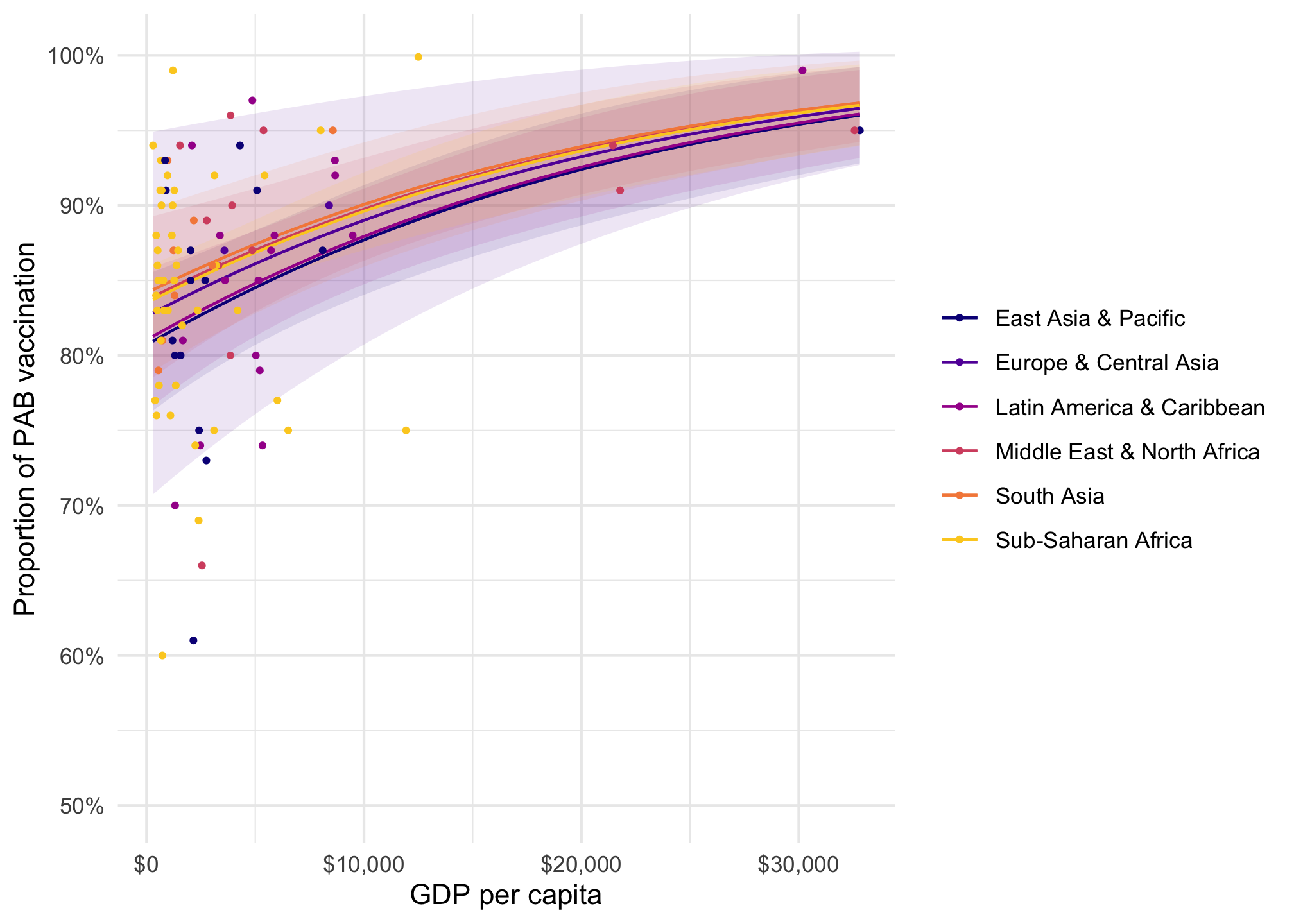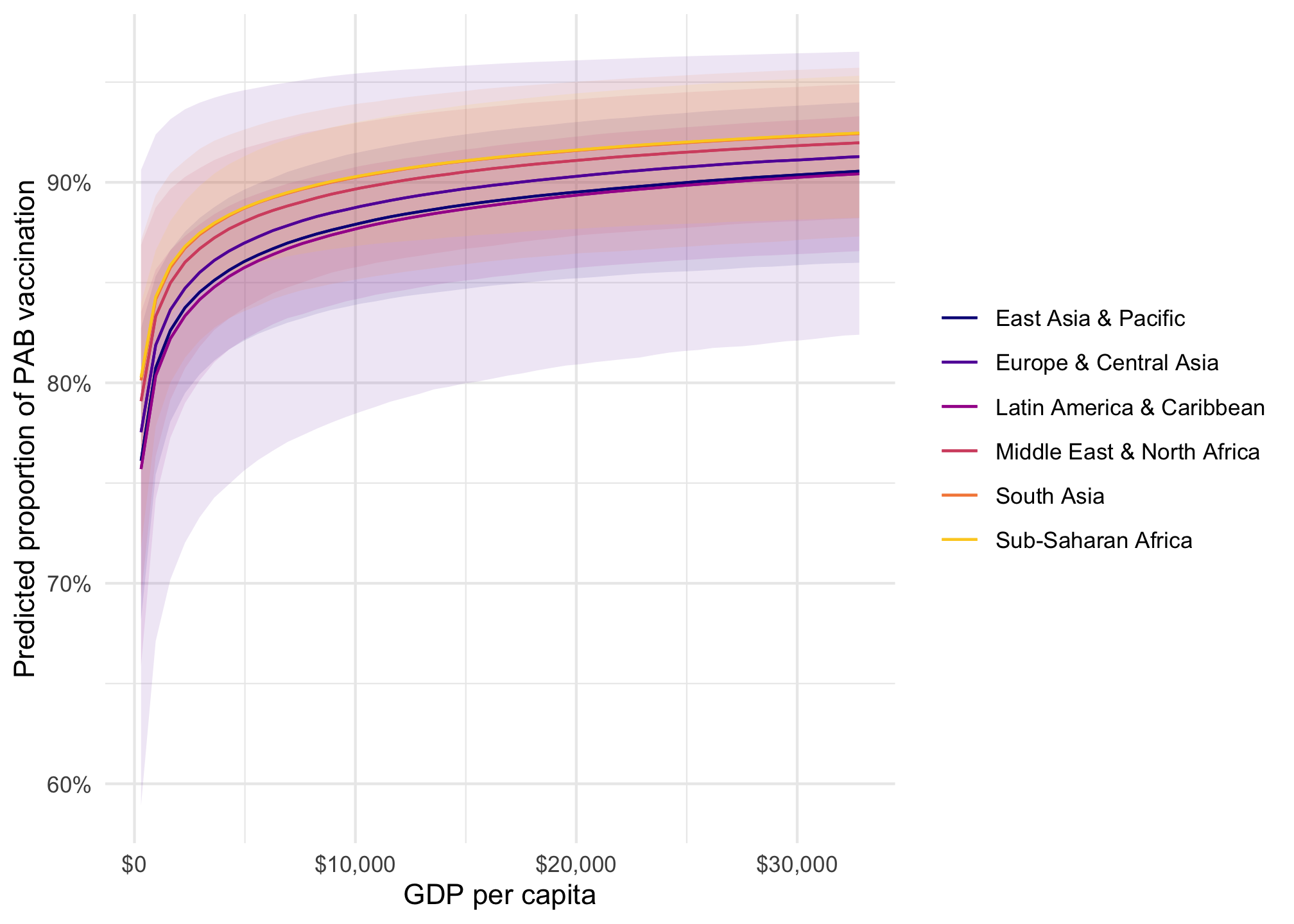 model_beta |>plot_predictions(condition ="gdp_per_cap") +scale_x_continuous(labels =label_dollar()) +scale_y_continuous(labels =label_percent()) +labs(x ="GDP per capita", y ="Predicted proportion of PAB vaccination", color =NULL, fill ="Region" )