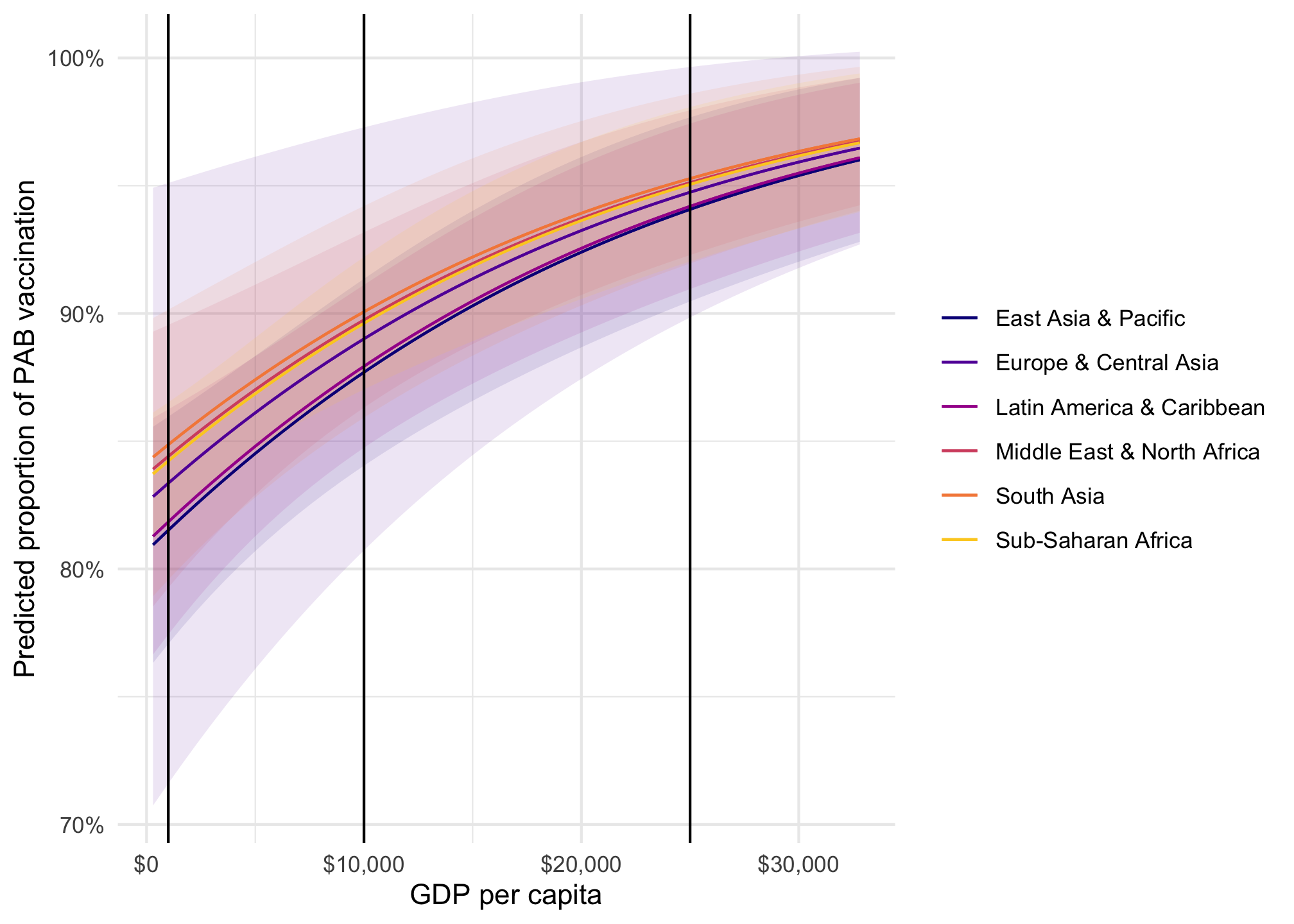 model_beta |>plot_predictions(condition =c("gdp_per_cap", "region")) +geom_vline(xintercept =c(1000, 10000, 25000)) +scale_color_viridis_d(option ="plasma", end =0.9) +scale_fill_viridis_d(option ="plasma", end =0.9, guide ="none") +scale_x_continuous(labels =label_dollar()) +scale_y_continuous(labels =label_percent()) +labs(x ="GDP per capita", y ="Predicted proportion of PAB vaccination", color =NULL, fill ="Region" )