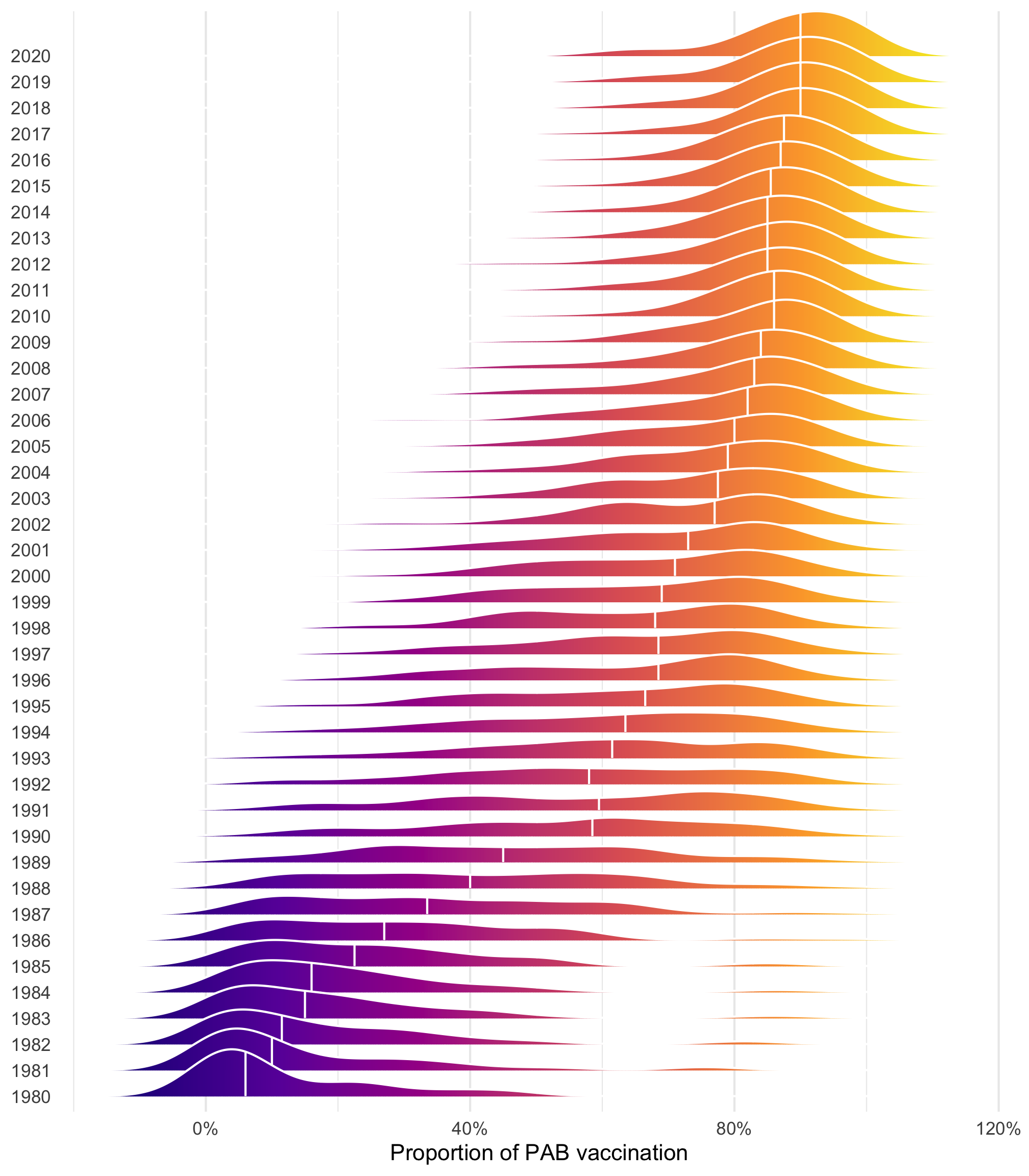 tetanus |>ggplot(aes(x = prop_pab, y =factor(year), fill =after_stat(x))) +geom_density_ridges_gradient(quantile_lines =TRUE, quantiles =2, color ="white") +scale_x_continuous(labels =label_percent()) +scale_fill_viridis_c(option ="plasma", guide ="none") +labs(x ="Proportion of PAB vaccination", y =NULL) +theme(panel.grid.major.y =element_blank())