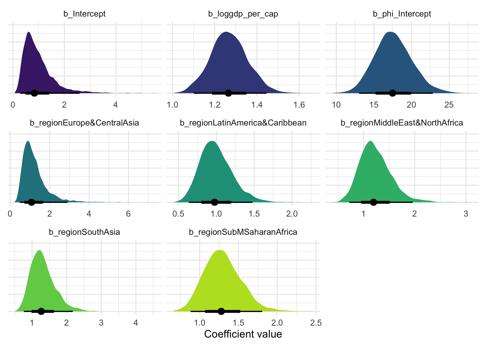 model_beta_bayes |>gather_draws(`^b_.*`, regex =TRUE) |>mutate(.value =exp(.value)) |>ggplot(aes(x = .value, fill = .variable)) +stat_halfeye(normalize ="xy") +scale_fill_viridis_d(option ="viridis", begin =0.1, end =0.9, guide ="none") +labs(x ="Coefficient value", y =NULL) +facet_wrap(vars(.variable), scales ="free_x") +theme(axis.text.y =element_blank())