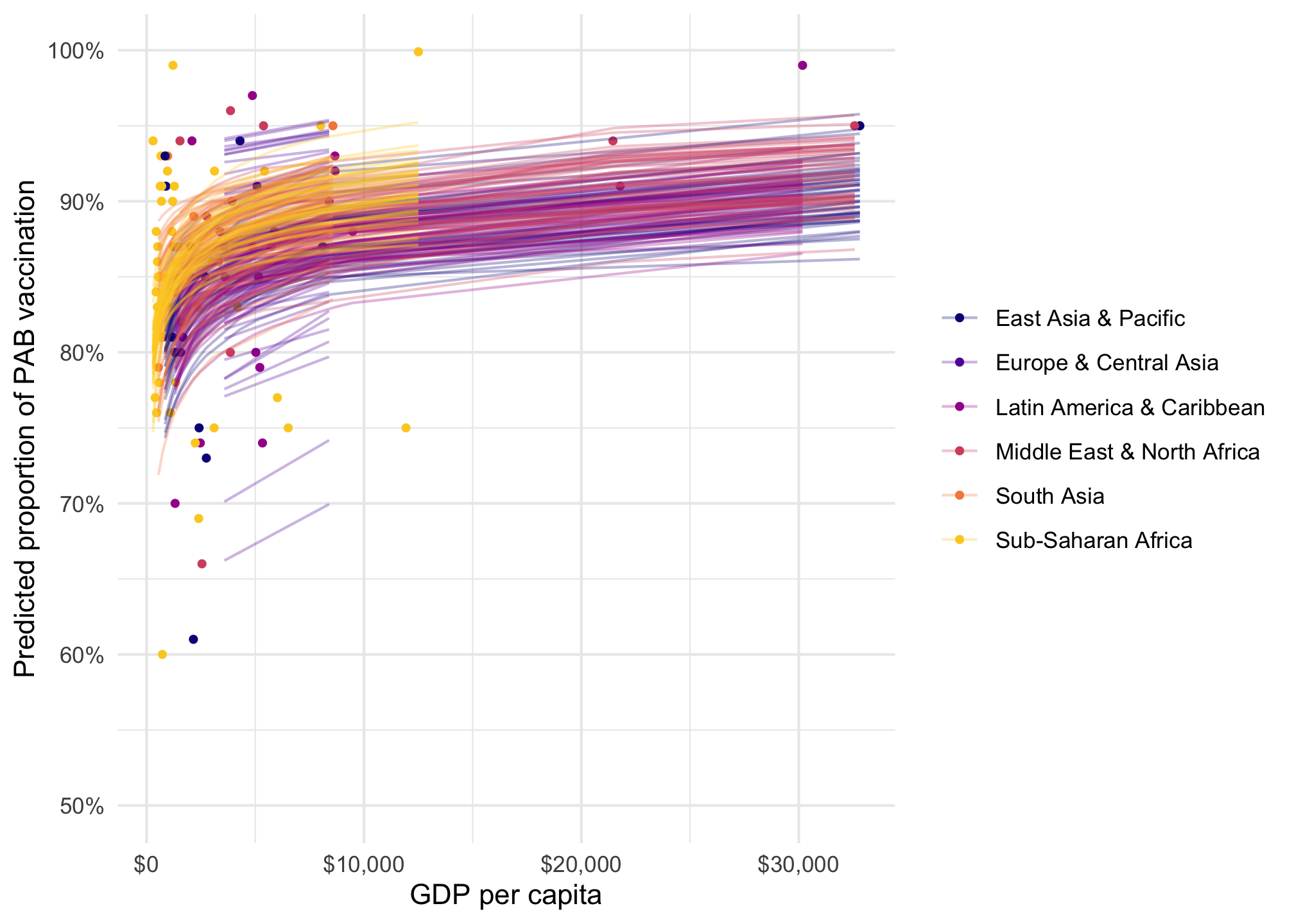 tetanus_2010 |>add_epred_draws(model_beta_bayes, ndraws =50) |>ggplot(aes(x = gdp_per_cap, y = prop_pab, color = region)) +geom_point(data = tetanus_2010, size =1) +geom_line(aes(y = .epred, group =paste(region, .draw)), linewidth =0.5, alpha =0.3) +scale_color_viridis_d(option ="plasma", end =0.9) +scale_x_continuous(labels =label_dollar()) +scale_y_continuous(labels =label_percent()) +labs(x ="GDP per capita", y ="Predicted proportion of PAB vaccination", color =NULL, fill ="Region" )
