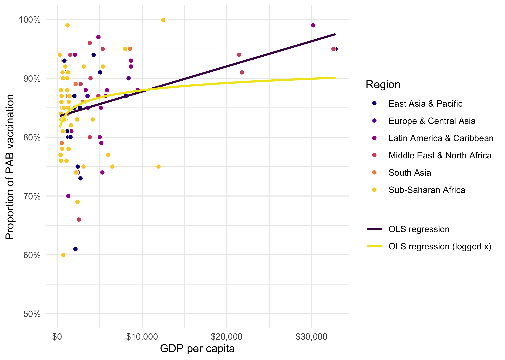 Instead of disaggregating everything by region and choosing arbitrary values of GDP per capita, we can also find the overall average slope of the line. Across all countries and regions different levels of GDP per capita, a $1,000 increase in GDP per capita is associated with a 0.665 percentage point increase in the proportion of vaccinated children, on average.