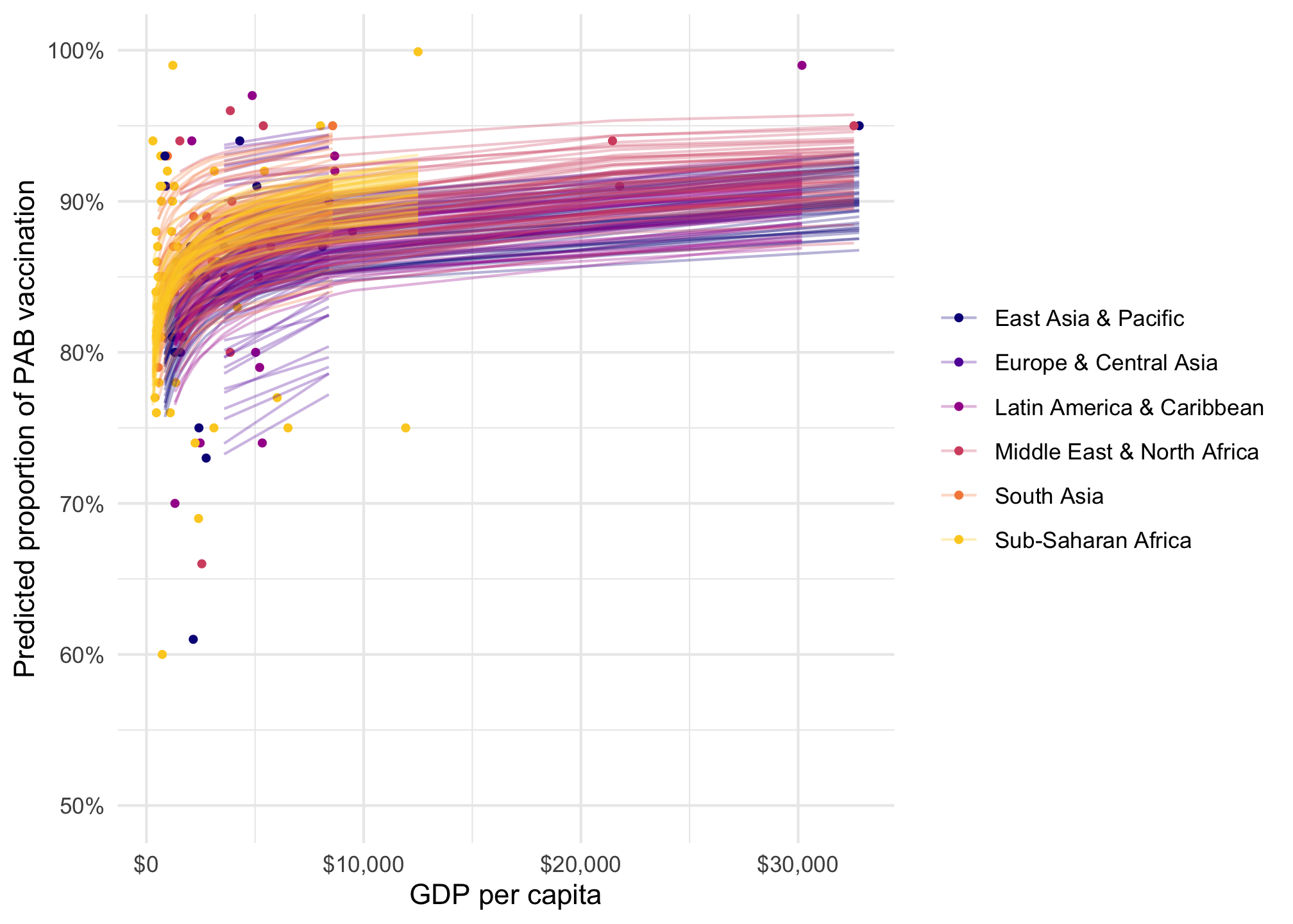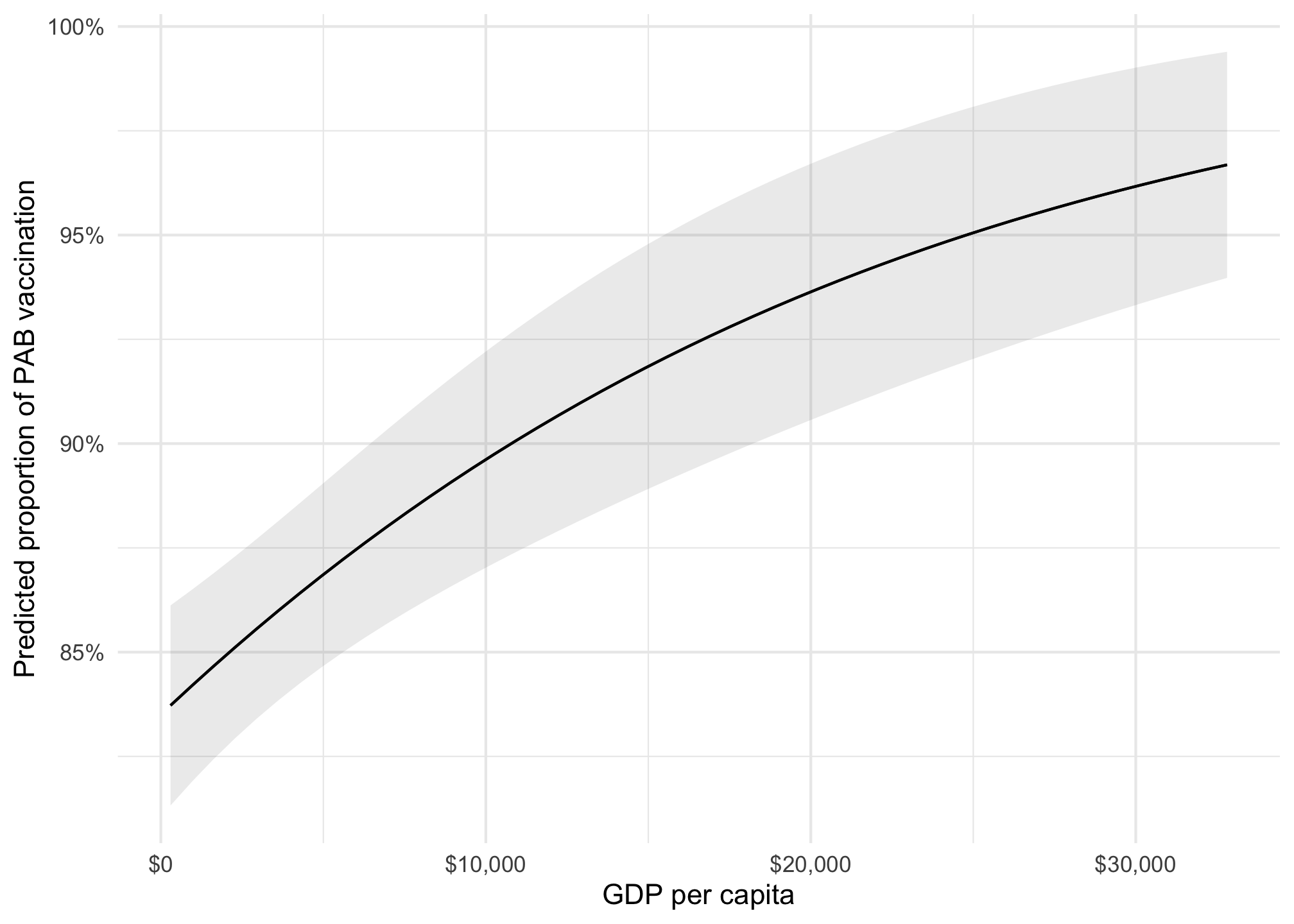 \[ \begin{aligned} \text{PAB vaccination}_i &\sim \operatorname{Beta}(\mu_i, \phi_i) \\ \operatorname{logit}(\mu_i) &= \beta_0 + \beta_1\ \text{GDP per capita}_i + \beta_{2 \dots 6}\ \text{Region}_i \\ \\ \beta_0 &\sim \operatorname{Student t}(\nu = 3, \mu = 0, \sigma = 2.5) \\ \beta_{1 \dots 6} &\sim \mathcal{N}(0, 1) \end{aligned} \]
