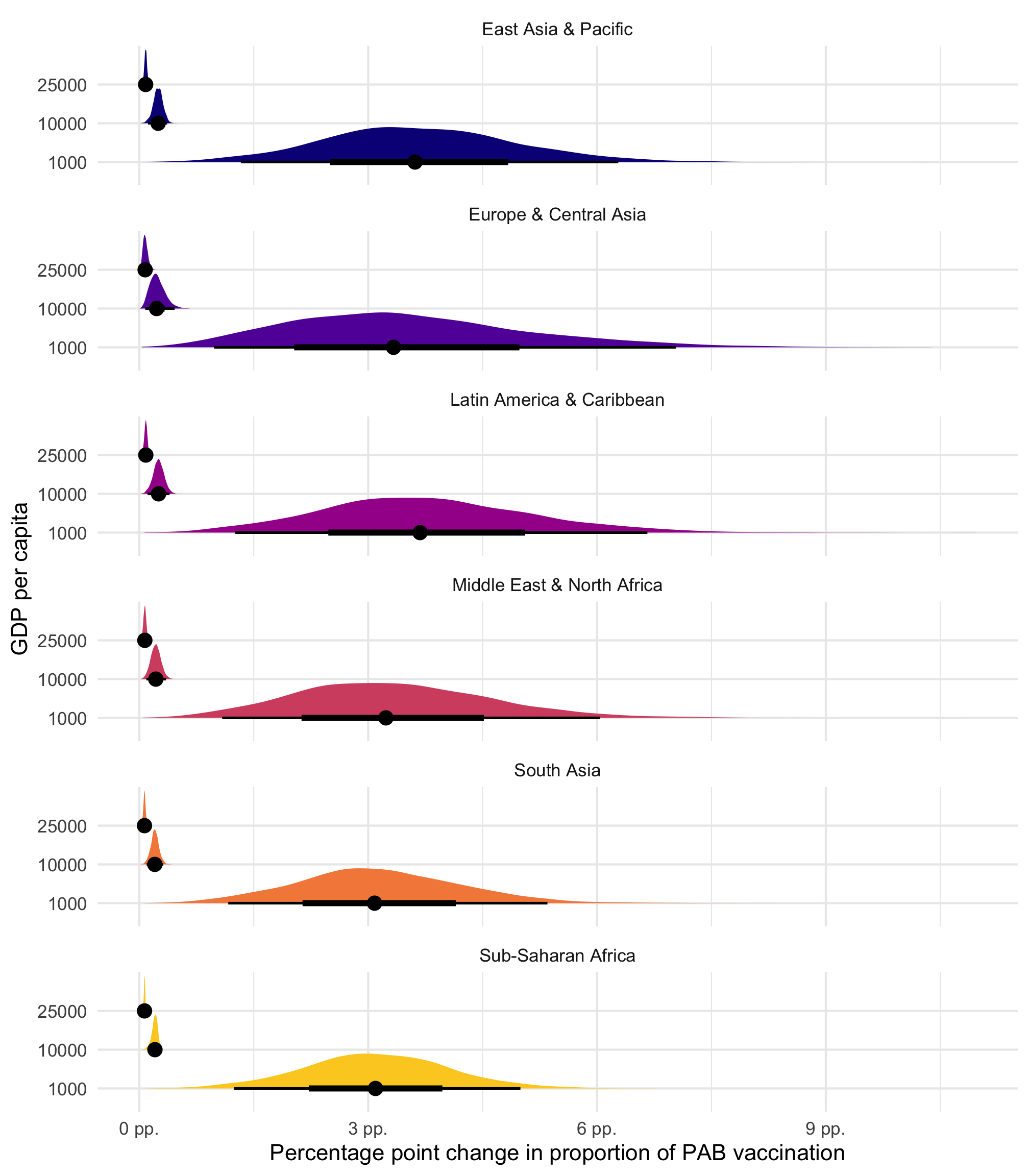In South Asia, a \$1,000 increase in GDP per capita for super poor countries where GDP per capita is only \$1,000 (i.e. going from \$1,000 to \$2,000) is associated with a 0.69 percentage point increase in the vaccination rate, while in rich countries where GDP per capita is \$25,000, a \$1,000 increase (i.e. going from \$25,000 to \$26,000) is associated with only a 0.24 percentage point increase. The slope in richer countries is shallower.