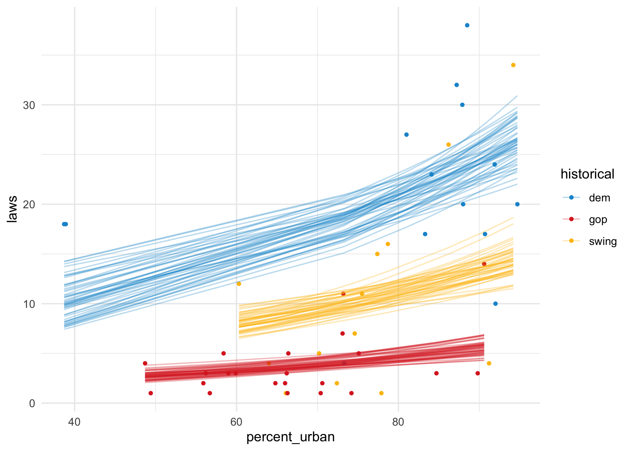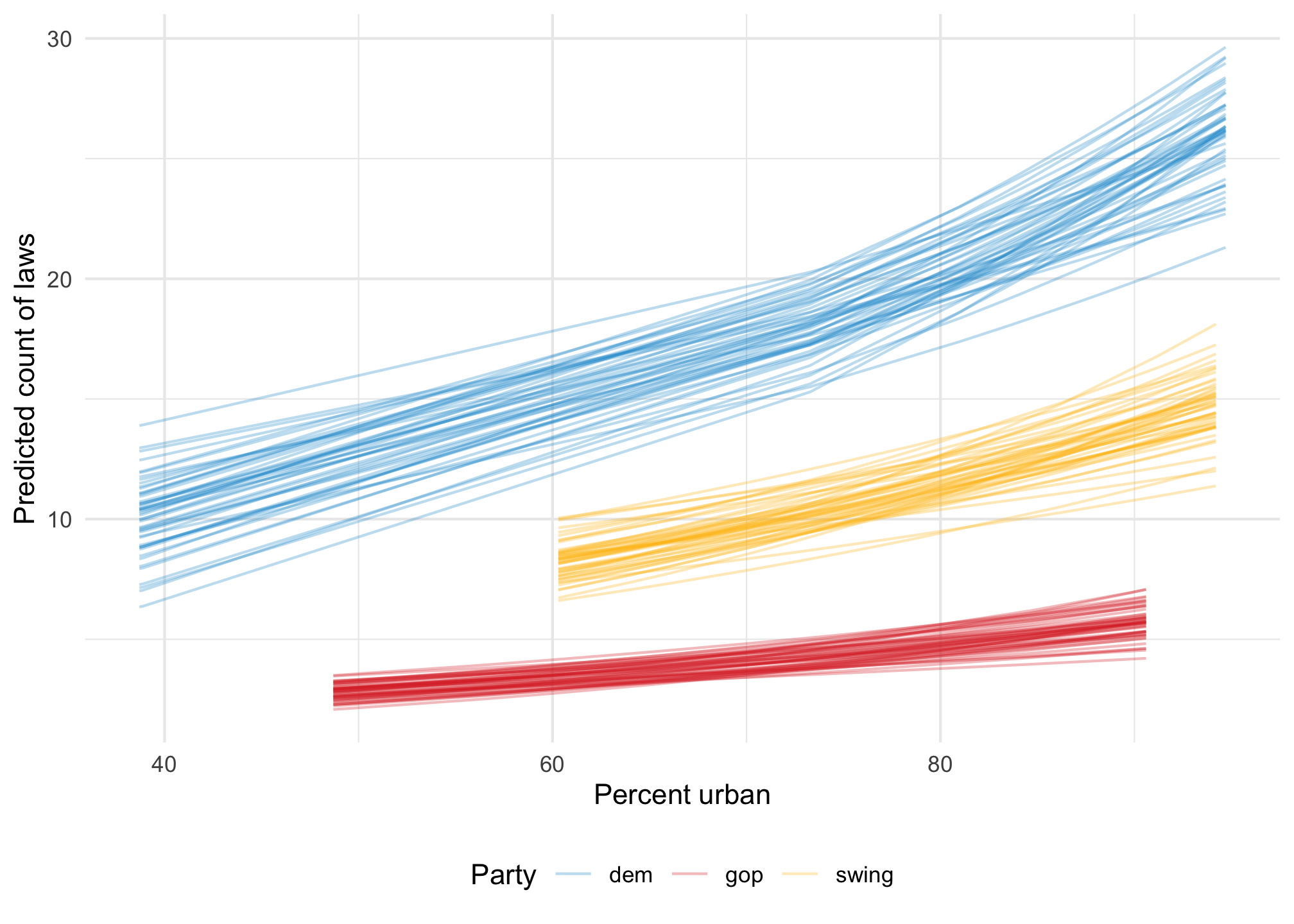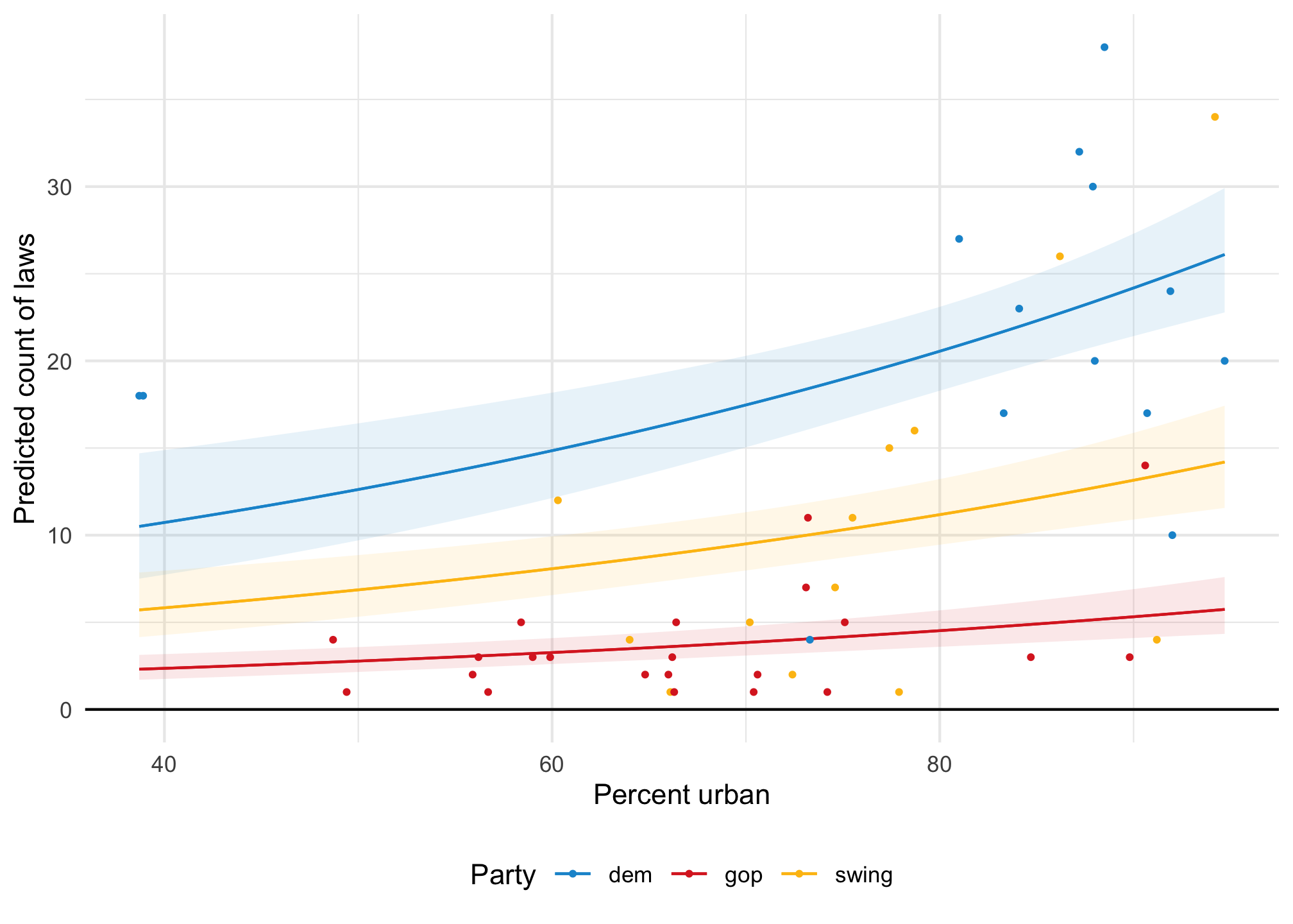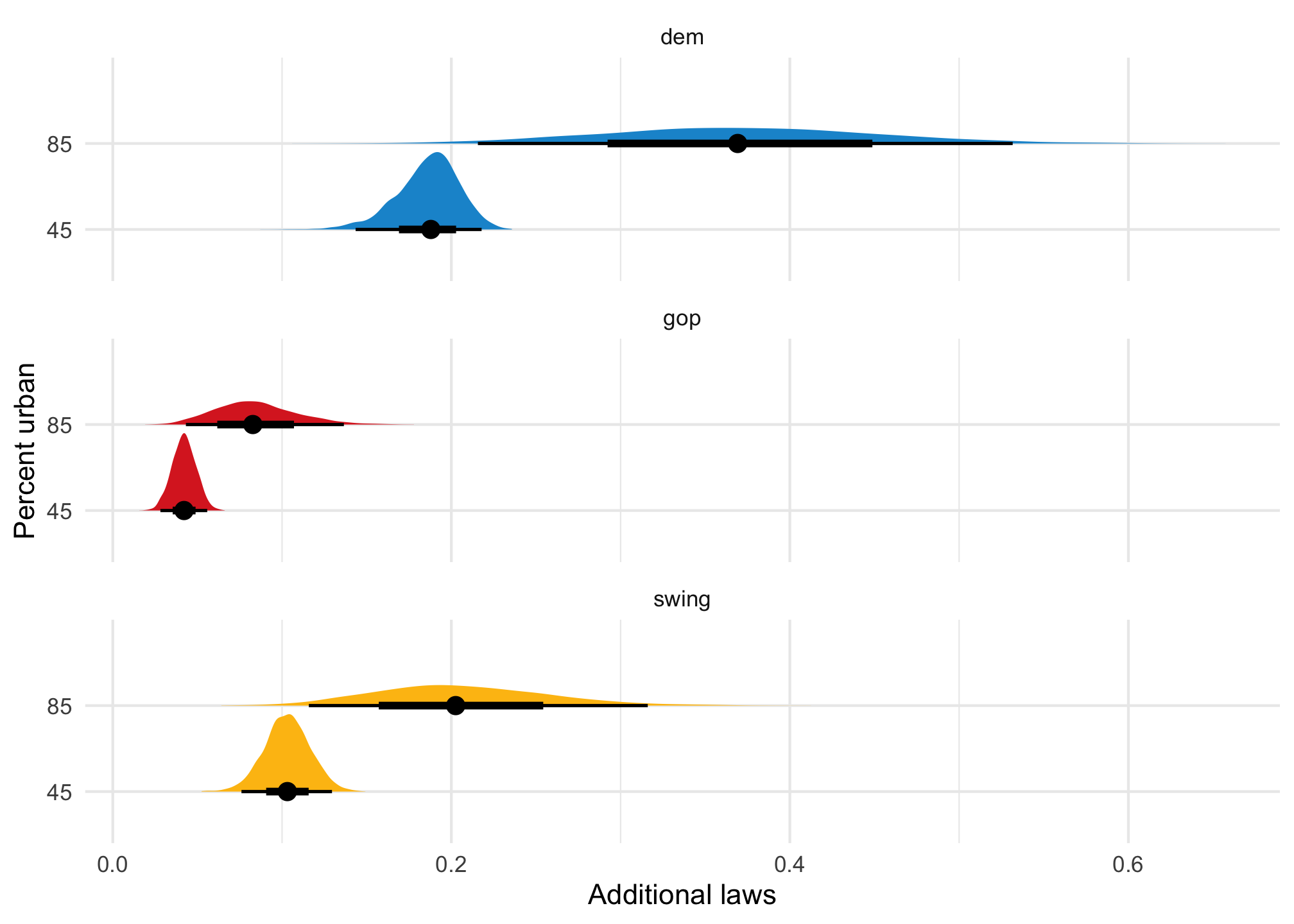 In Democratic states, a 1 percentage point increase in urbanness is associated with 0.189 additional laws in rural (45%) states and 0.363 additional laws in urban (85%) states; in Republican states, a 1 percentage point increase in urbanness is associated with 0.04 additional laws in rural (45%) states and 0.08 ladditional laws in urban (85%) states.