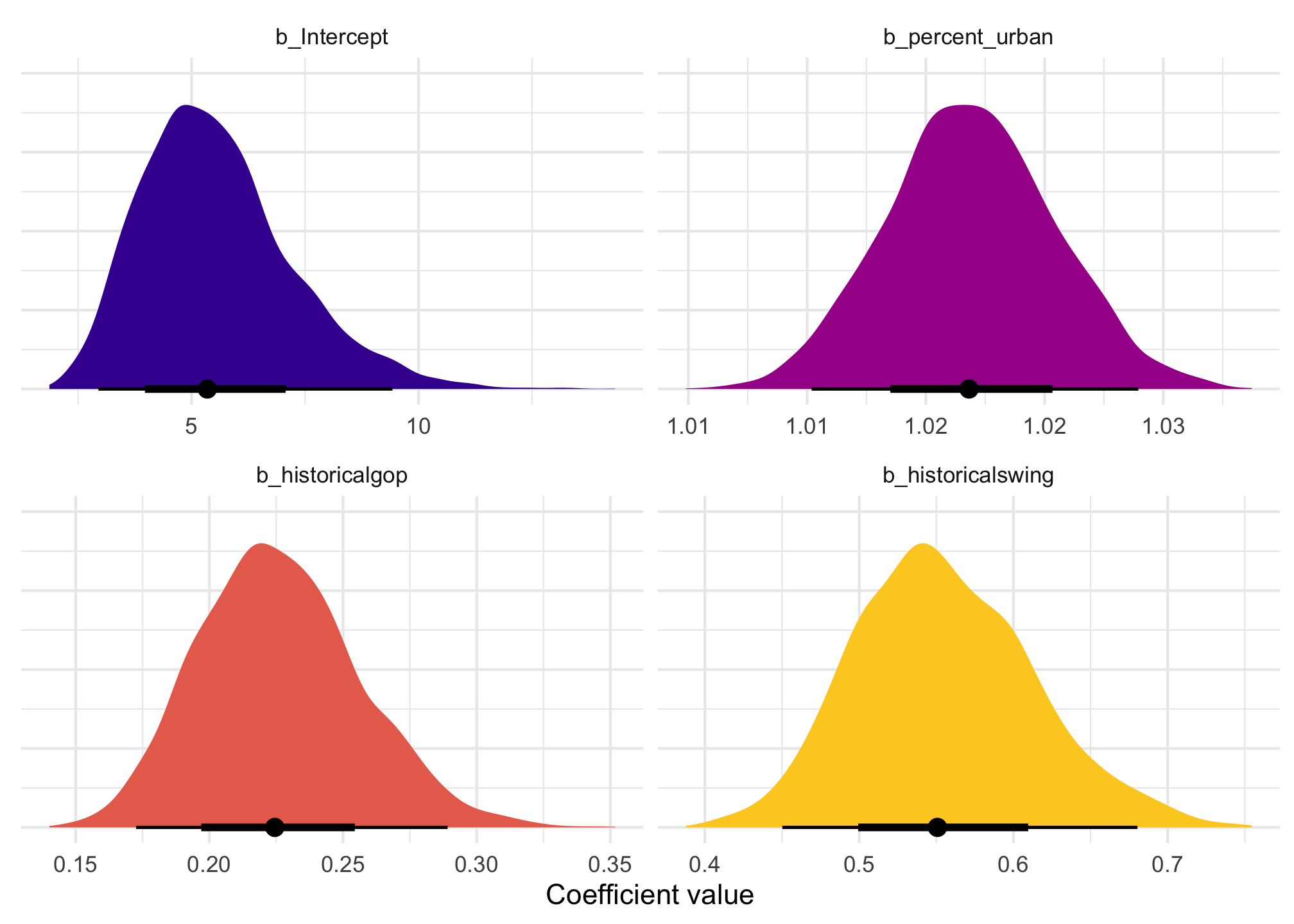 \[ \begin{aligned} \text{Laws}_i &\sim \operatorname{Poisson}(\lambda_i) \\ \log(\lambda_i) &= \beta_0 + \beta_1\ \text{Percent urban}_i + \beta_2\ \text{GOP}_i + \beta_3\ \text{Swing}_i \\ \\ \beta_0 &\sim \mathcal{N}(0, 2) \\ \beta_{1 \dots 3} &\sim \operatorname{Student t}(\nu = 3, \mu = 0, \sigma = 1) \end{aligned} \]