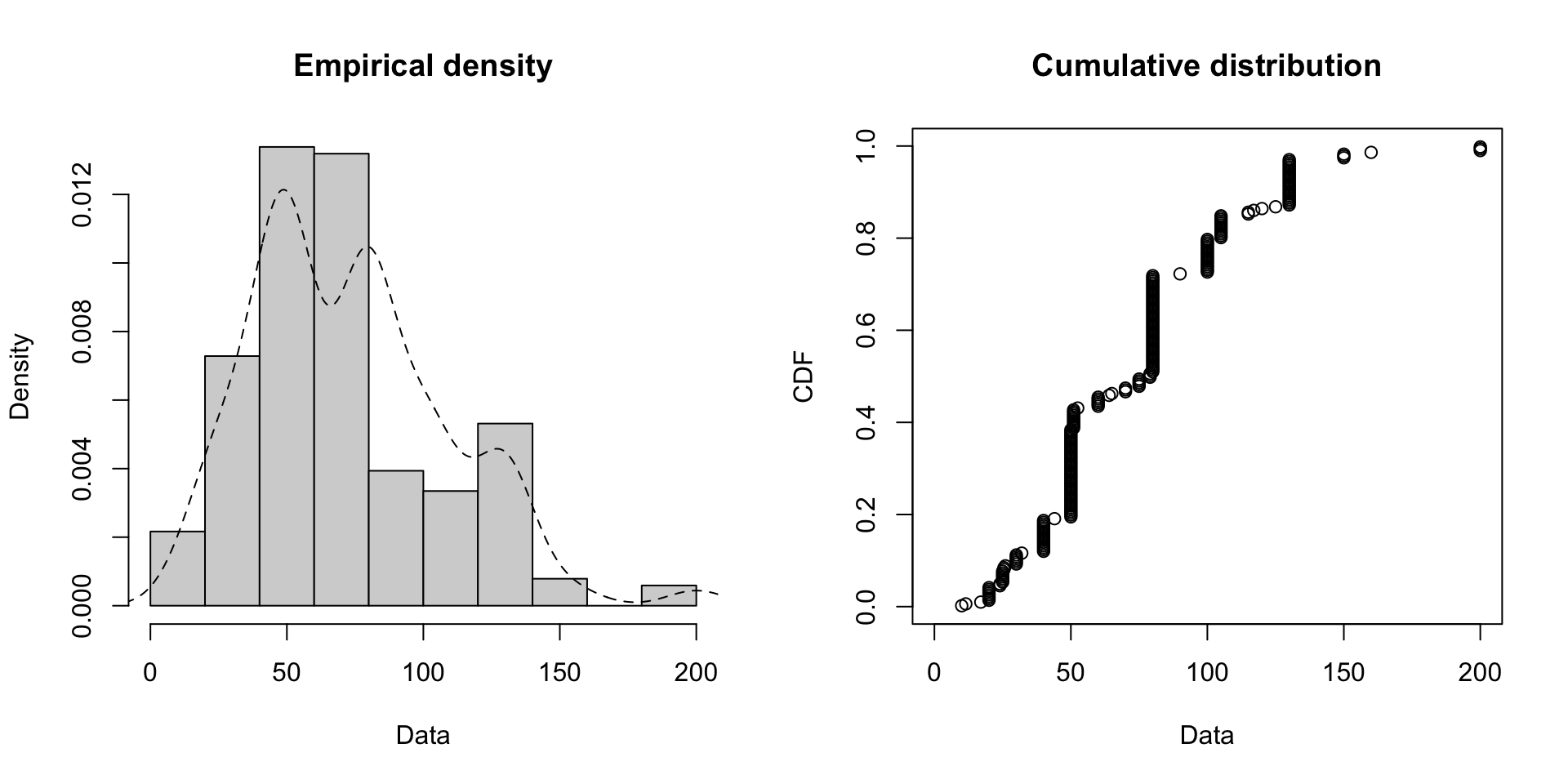)One thing to note: libraries like fitdistrplus allow you to fit distributions to the data (in this case, using maximum likelihood density estimation to ‘smooth’ the underlying probability density).